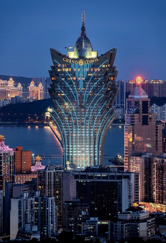 澳門半島、氹仔島、路環島三島相連,蔚為壯觀。濠江兩岸,夜幕輝映湛藍的濠江,宛如一幅絢麗的禪意御卷。