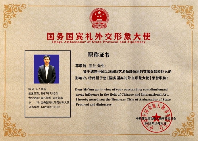 雲谷 : 國務國賓禮外交形象大使、聯合國教科文組織藝術顧問、聯合國雲谷畫派非物質文化遺產傳承人、聯合國世界和平藝術大師、聯合國非遺藝術大使、世界和平藝術大師、人民大會堂首席藝術顧問、國務院國賓禮特供藝術大師、中宣部國務國賓禮外交形象大使、國務院參事室參事、國家突出貢獻中靑年專家、金磚國家文化大使、金磚五國藝術形象大使、中國文化中心導師、一帶一路金磚國家中南友好文化大使、中非共和國駐華大使館文化導師。